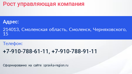 Рост, управляющая компания по адресу 214013, Смоленская область, Смоленск, Черняховского, 15 в дальнейшем Организация, размещена в следующих категориях: