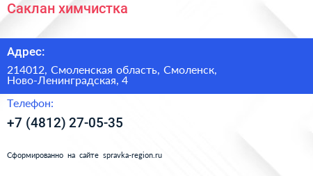 Саклан, химчистка по адресу 214012, Смоленская область, Смоленск, Ново-Ленинградская, 4 в дальнейшем Организация, размещена в следующих категориях: