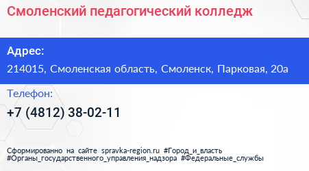 Смоленский педагогический колледж по адресу 214015, Смоленская область, Смоленск, Парковая, 20а в дальнейшем Организация, размещена в следующих категориях: