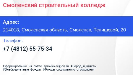 Смоленский строительный колледж по адресу 214018, Смоленская область, Смоленск, Тенишевой, 20 в дальнейшем Организация, размещена в следующих категориях: