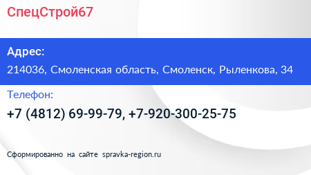 СпецСтрой67 по адресу 214036, Смоленская область, Смоленск, Рыленкова, 34 в дальнейшем Организация, размещена в следующих категориях: