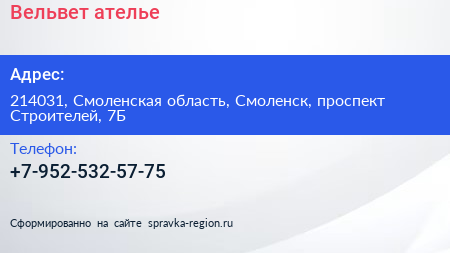 Вельвет, ателье по адресу 214031, Смоленская область, Смоленск, проспект Строителей, 7Б в дальнейшем Организация, размещена в следующих категориях: