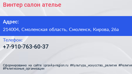 Винтер, салон-ателье по адресу 214004, Смоленская область, Смоленск, Кирова, 26а в дальнейшем Организация, размещена в следующих категориях: