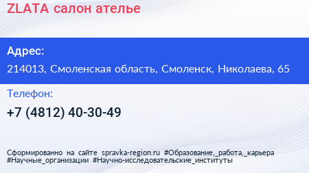 ZLATA, салон-ателье по адресу 214013, Смоленская область, Смоленск, Николаева, 65 в дальнейшем Организация, размещена в следующих категориях: