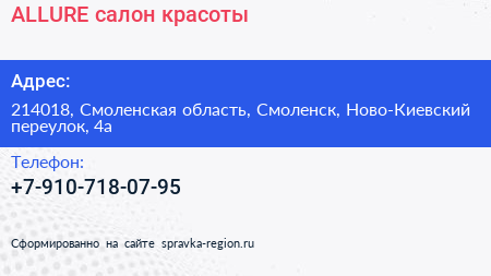 ALLURE, салон красоты по адресу 214018, Смоленская область, Смоленск, Ново-Киевский переулок, 4а в дальнейшем Организация, размещена в следующих категориях: