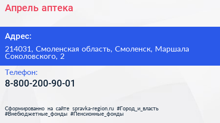 Апрель, аптека по адресу 214031, Смоленская область, Смоленск, Маршала Соколовского, 2 в дальнейшем Организация, размещена в следующих категориях: