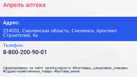 Апрель, аптека по адресу 214031, Смоленская область, Смоленск, проспект Строителей, 4а в дальнейшем Организация, размещена в следующих категориях: