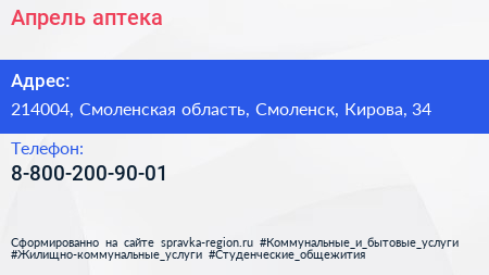 Апрель, аптека по адресу 214004, Смоленская область, Смоленск, Кирова, 34 в дальнейшем Организация, размещена в следующих категориях: