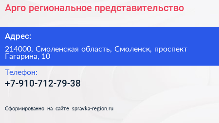 Арго, региональное представительство по адресу 214000, Смоленская область, Смоленск, проспект Гагарина, 10 в дальнейшем Организация, размещена в следующих категориях: