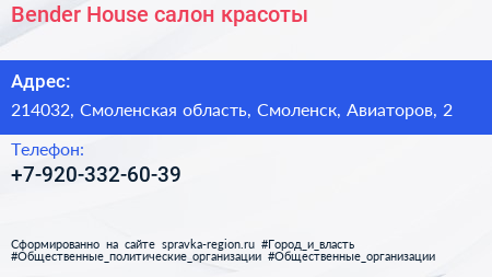 Bender House, салон красоты по адресу 214032, Смоленская область, Смоленск, Авиаторов, 2 в дальнейшем Организация, размещена в следующих категориях: