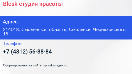 Blesk, студия красоты по адресу 214013, Смоленская область, Смоленск, Черняховского, 15 в дальнейшем Организация, размещена в следующих категориях: