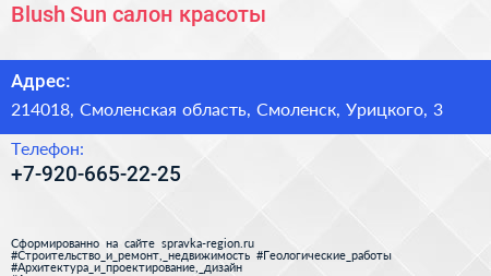Blush & Sun, салон красоты по адресу 214018, Смоленская область, Смоленск, Урицкого, 3 в дальнейшем Организация, размещена в следующих категориях: