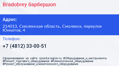 Bradobrey, барбершоп по адресу 214013, Смоленская область, Смоленск, переулок Юннатов, 4 в дальнейшем Организация, размещена в следующих категориях: