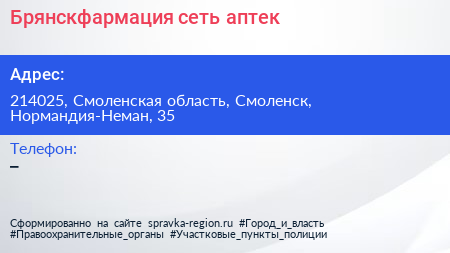 Брянскфармация, сеть аптек по адресу 214025, Смоленская область, Смоленск, Нормандия-Неман, 35 в дальнейшем Организация, размещена в следующих категориях: