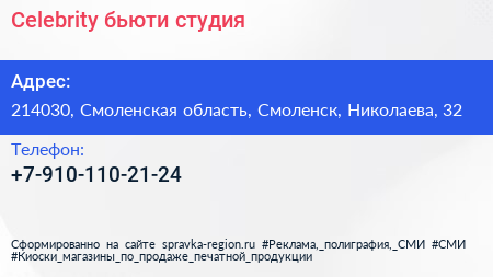 Celebrity, бьюти-студия по адресу 214030, Смоленская область, Смоленск, Николаева, 32 в дальнейшем Организация, размещена в следующих категориях:
