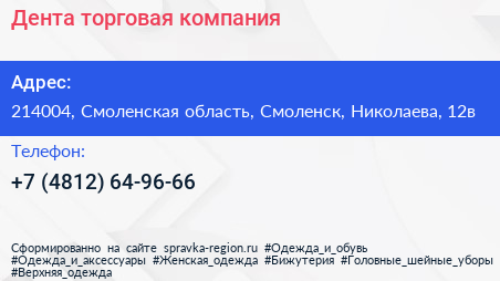 Дента, торговая компания по адресу 214004, Смоленская область, Смоленск, Николаева, 12в в дальнейшем Организация, размещена в следующих категориях: