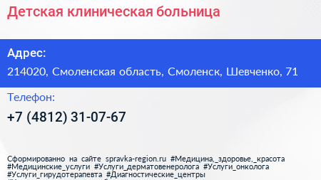 Детская клиническая больница по адресу 214020, Смоленская область, Смоленск, Шевченко, 71 в дальнейшем Организация, размещена в следующих категориях: