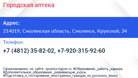Городская аптека по адресу 214019, Смоленская область, Смоленск, Крупской, 34 в дальнейшем Организация, размещена в следующих категориях: