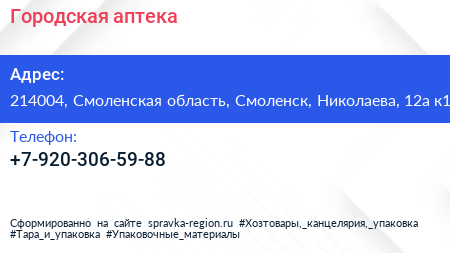 Городская аптека по адресу 214004, Смоленская область, Смоленск, Николаева, 12а к1 в дальнейшем Организация, размещена в следующих категориях: