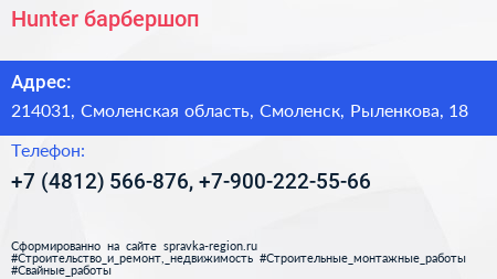 Hunter, барбершоп по адресу 214031, Смоленская область, Смоленск, Рыленкова, 18 в дальнейшем Организация, размещена в следующих категориях: