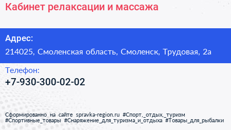 Кабинет релаксации и массажа по адресу 214025, Смоленская область, Смоленск, Трудовая, 2а в дальнейшем Организация, размещена в следующих категориях: