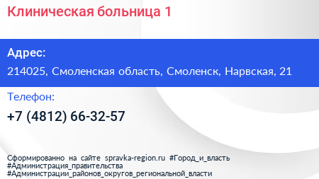 Клиническая больница №1 по адресу 214025, Смоленская область, Смоленск, Нарвская, 21 в дальнейшем Организация, размещена в следующих категориях: