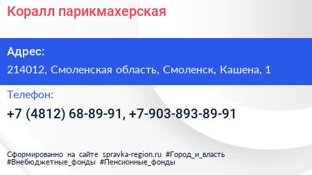 Коралл, парикмахерская по адресу 214012, Смоленская область, Смоленск, Кашена, 1 в дальнейшем Организация, размещена в следующих категориях: