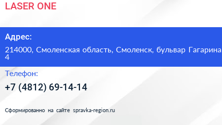 LASER ONE по адресу 214000, Смоленская область, Смоленск, бульвар Гагарина, 4 в дальнейшем Организация, размещена в следующих категориях: