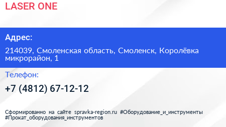 LASER ONE по адресу 214039, Смоленская область, Смоленск, Королёвка микрорайон, 1 в дальнейшем Организация, размещена в следующих категориях: