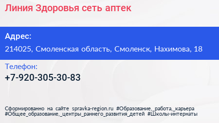 Линия Здоровья, сеть аптек по адресу 214025, Смоленская область, Смоленск, Нахимова, 18 в дальнейшем Организация, размещена в следующих категориях: