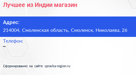 Лучшее из Индии, магазин по адресу 214004, Смоленская область, Смоленск, Николаева, 26 в дальнейшем Организация, размещена в следующих категориях: