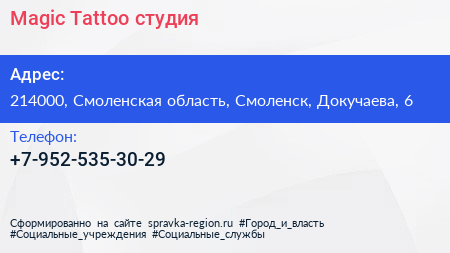 Magic Tattoo, студия по адресу 214000, Смоленская область, Смоленск, Докучаева, 6 в дальнейшем Организация, размещена в следующих категориях: