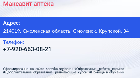 Максавит, аптека по адресу 214019, Смоленская область, Смоленск, Крупской, 34 в дальнейшем Организация, размещена в следующих категориях: