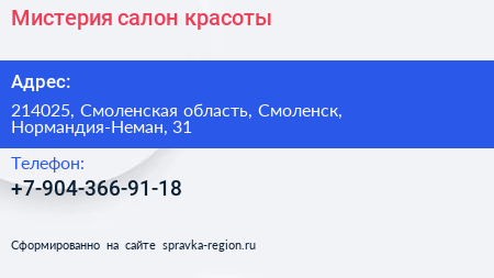Мистерия, салон красоты по адресу 214025, Смоленская область, Смоленск, Нормандия-Неман, 31 в дальнейшем Организация, размещена в следующих категориях: