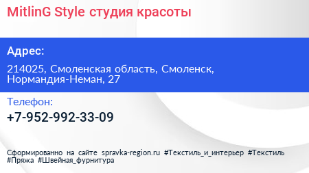 MitlinG Style, студия красоты по адресу 214025, Смоленская область, Смоленск, Нормандия-Неман, 27 в дальнейшем Организация, размещена в следующих категориях: