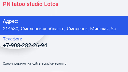PN tatoo-studio Lotos по адресу 214530, Смоленская область, Смоленск, Минская, 5а в дальнейшем Организация, размещена в следующих категориях: