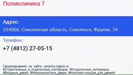 Поликлиника №7 по адресу 214006, Смоленская область, Смоленск, Фрунзе, 74 в дальнейшем Организация, размещена в следующих категориях: