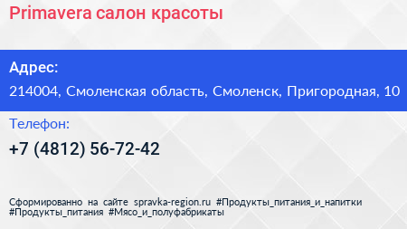 Primavera, салон красоты по адресу 214004, Смоленская область, Смоленск, Пригородная, 10 в дальнейшем Организация, размещена в следующих категориях: