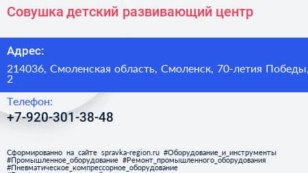 Совушка, детский развивающий центр по адресу 214036, Смоленская область, Смоленск, 70-летия Победы, 2 в дальнейшем Организация, размещена в следующих категориях: