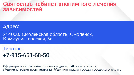 Святослав, кабинет анонимного лечения зависимостей по адресу 214000, Смоленская область, Смоленск, Коммунистическая, 5а в дальнейшем Организация, размещена в следующих категориях:
