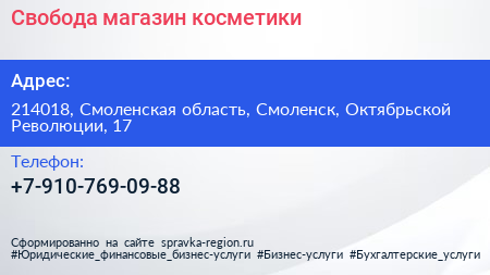 Свобода, магазин косметики по адресу 214018, Смоленская область, Смоленск, Октябрьской Революции, 17 в дальнейшем Организация, размещена в следующих категориях: