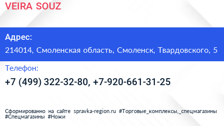 VEIRA-SOUZ по адресу 214014, Смоленская область, Смоленск, Твардовского, 5 в дальнейшем Организация, размещена в следующих категориях: