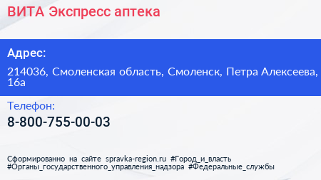 ВИТА Экспресс, аптека по адресу 214036, Смоленская область, Смоленск, Петра Алексеева, 16а в дальнейшем Организация, размещена в следующих категориях: