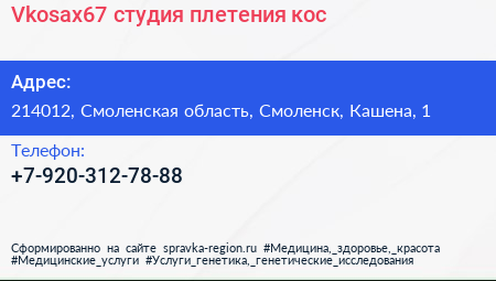 Vkosax67, студия плетения кос по адресу 214012, Смоленская область, Смоленск, Кашена, 1 в дальнейшем Организация, размещена в следующих категориях: