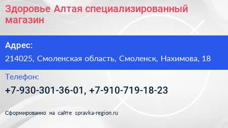 Здоровье Алтая, специализированный магазин по адресу 214025, Смоленская область, Смоленск, Нахимова, 18 в дальнейшем Организация, размещена в следующих категориях: