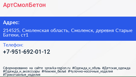 АртСмолБетон по адресу 214525, Смоленская область, Смоленск, деревня Старые Батеки, ст1 в дальнейшем Организация, размещена в следующих категориях: