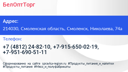 БелОптТорг по адресу 214030, Смоленская область, Смоленск, Николаева, 74а в дальнейшем Организация, размещена в следующих категориях:
