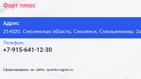Форт плюс по адресу 214020, Смоленская область, Смоленск, Смольянинова, 2а в дальнейшем Организация, размещена в следующих категориях: