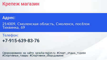 Крепеж, магазин по адресу 214009, Смоленская область, Смоленск, посёлок Тихвинка, 69 в дальнейшем Организация, размещена в следующих категориях: