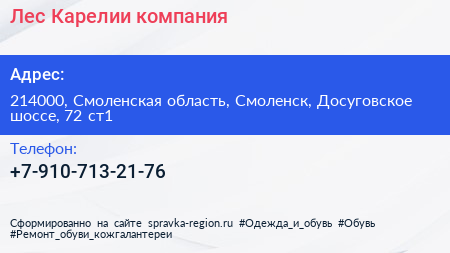 Лес Карелии, компания по адресу 214000, Смоленская область, Смоленск, Досуговское шоссе, 72 ст1 в дальнейшем Организация, размещена в следующих категориях: